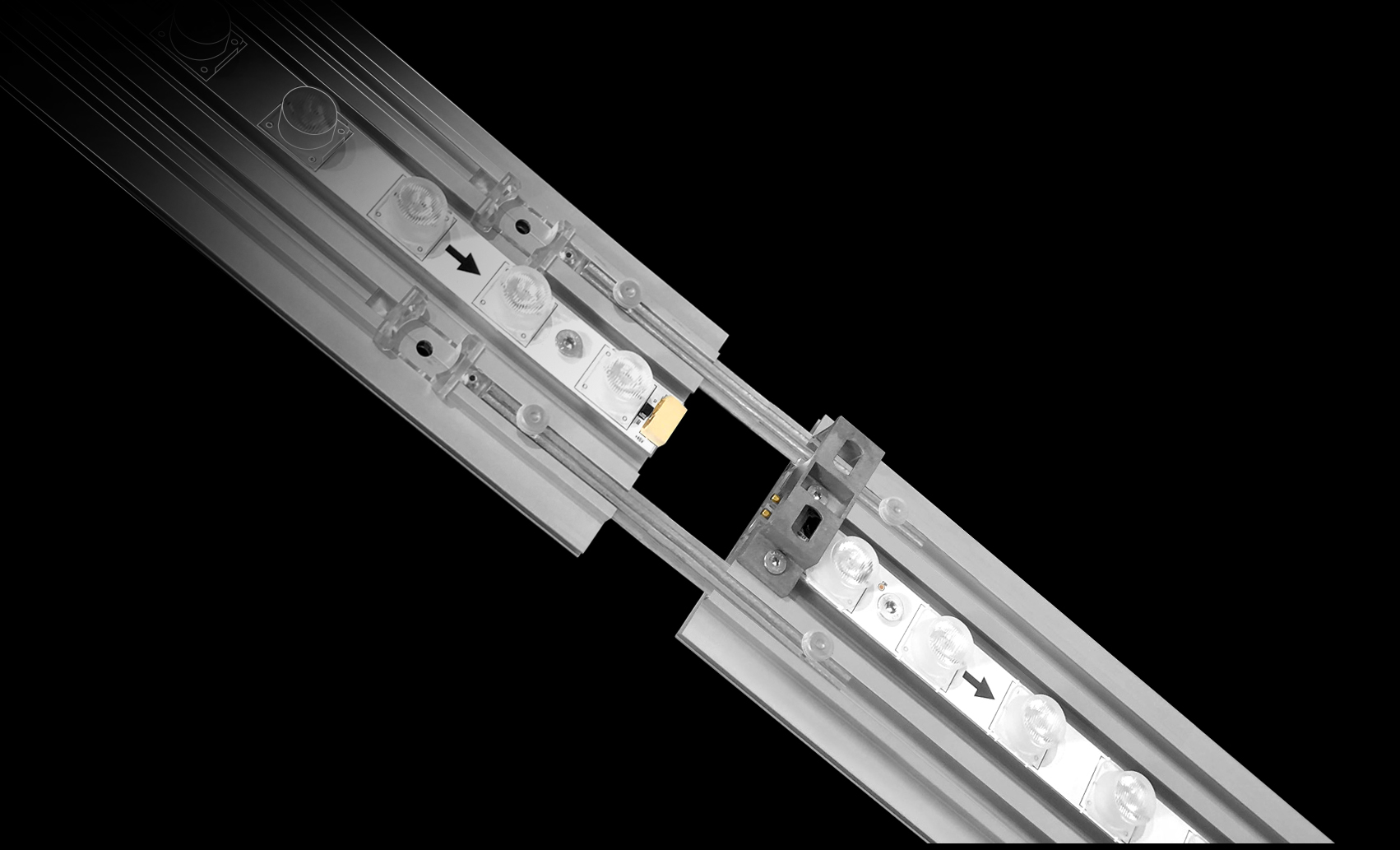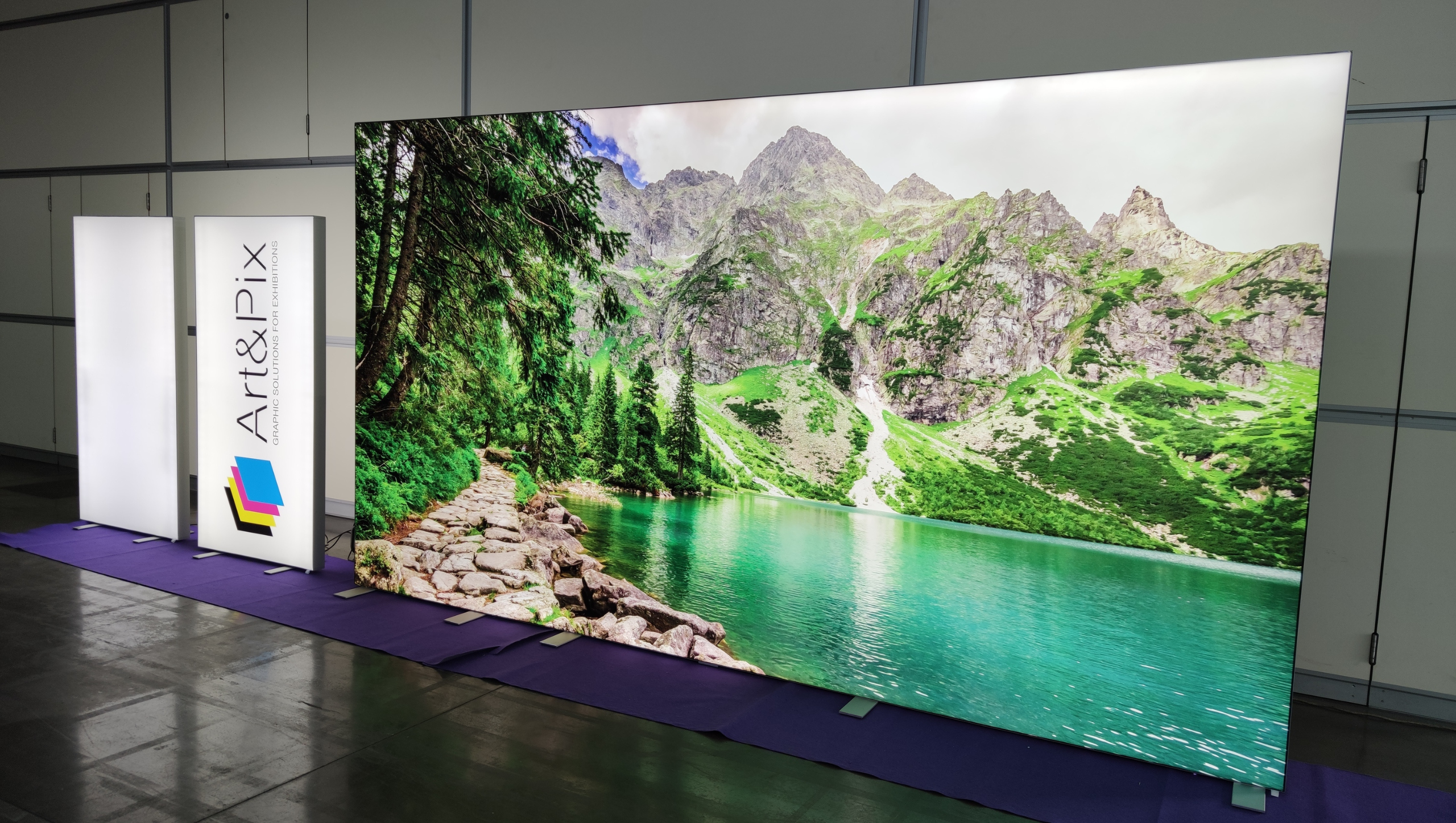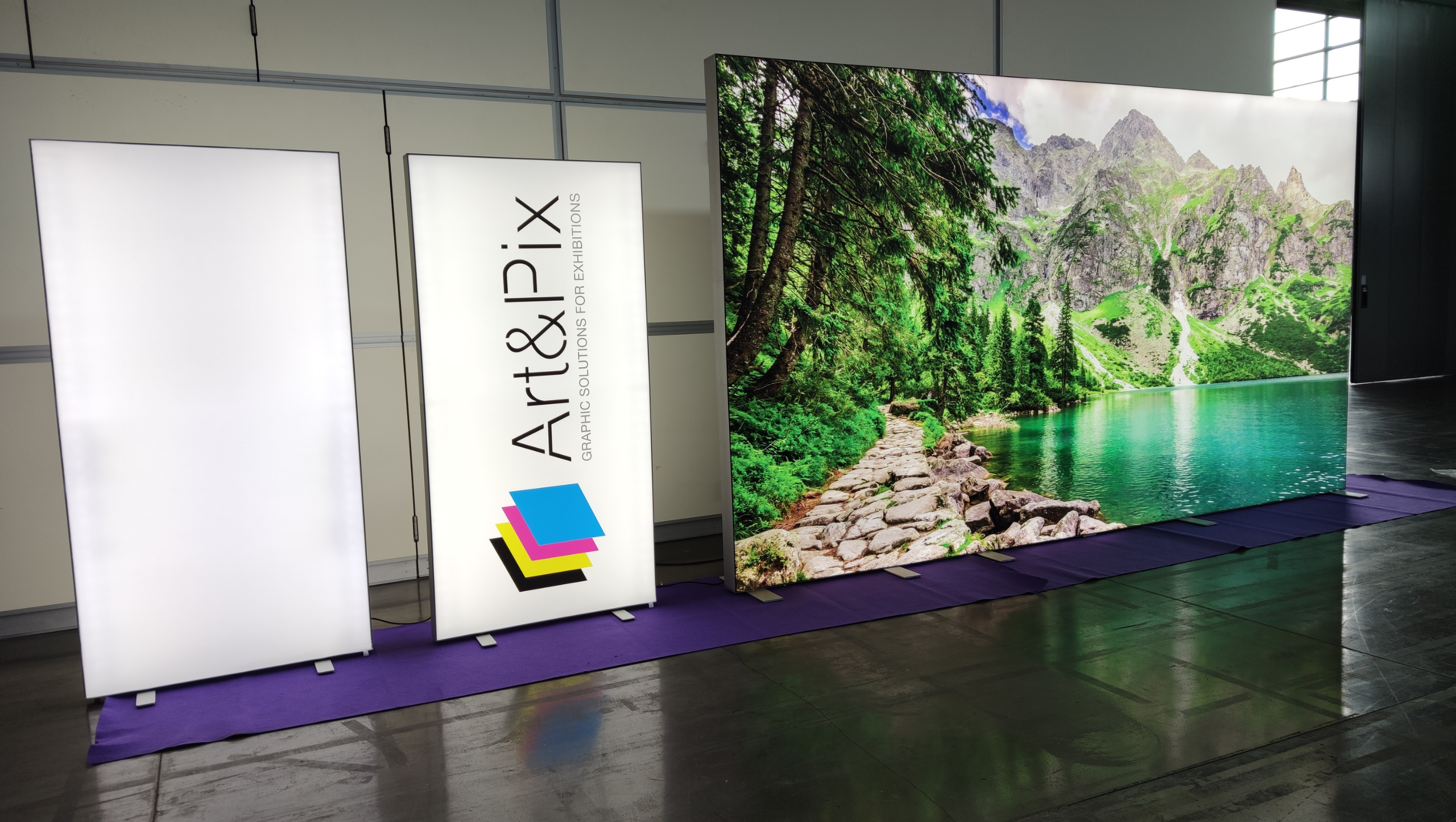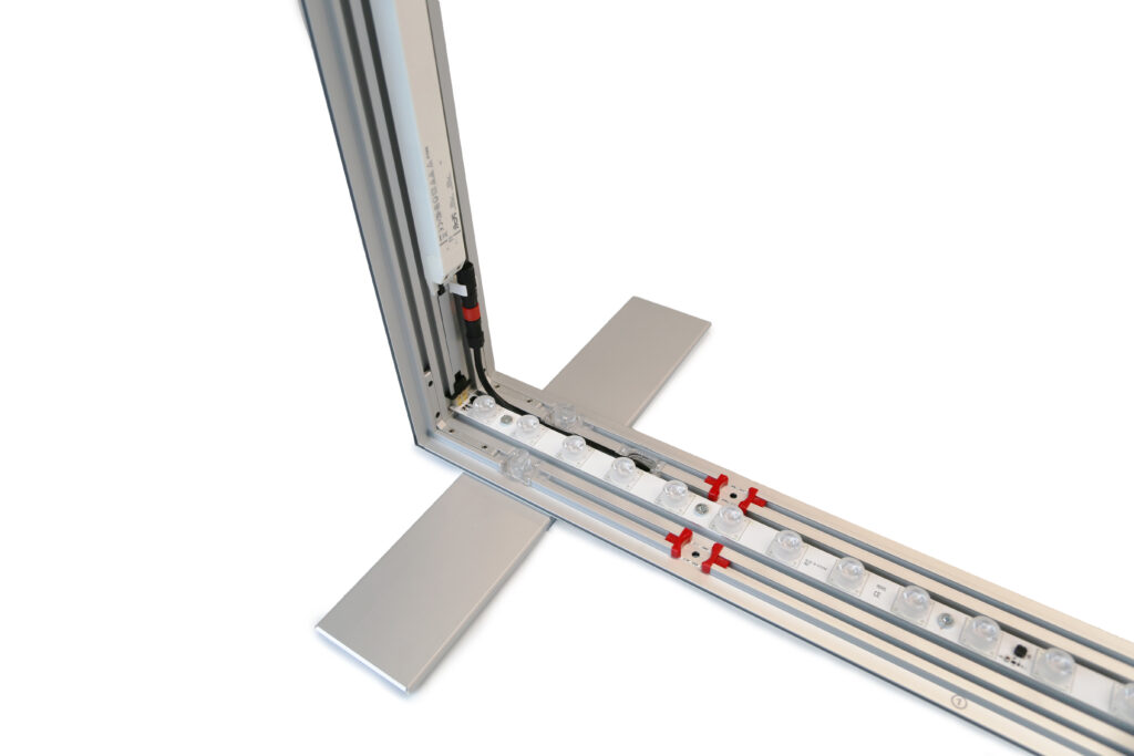 Sistema a telaio illuminato mobile, leggero e super luminoso. Realizzato in profili di alluminio anodizzato argento ha una dimensione standard di cm 100x200 ed un peso di soli 9.5 Kg.